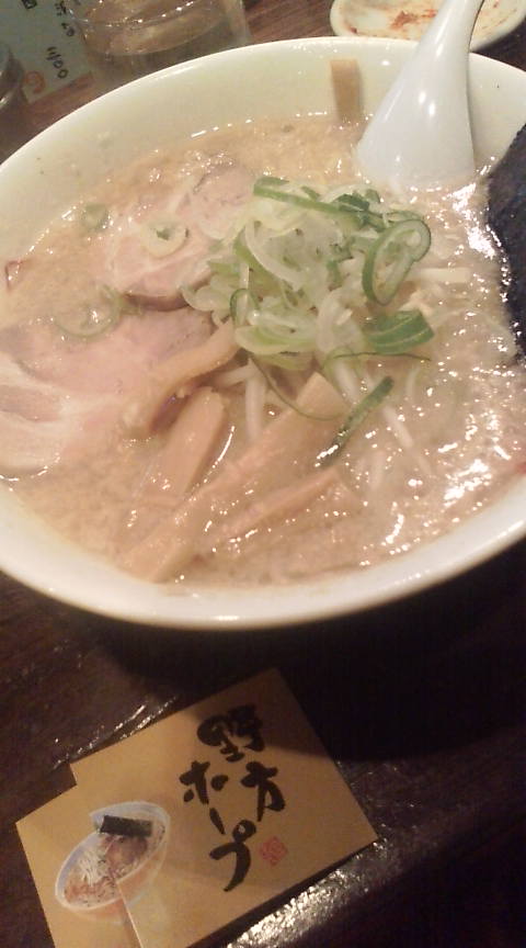 今日は朝から場当たりをやりまくったので、かなりの空腹。帰りにメンバーとマッキーお勧めの野方ホープへ出陣。ラーメンについては、び~ば~笑平が詳しいので、そちらのブログを参照あれ。ほいぢゃが、旨かったよ。