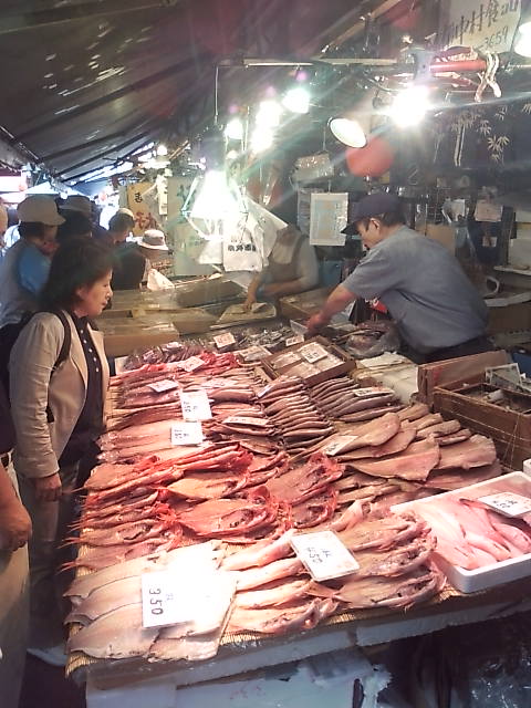 日系アメリカ人でハワイ在住の老夫婦で日本観光で11日間で広島、大阪、京都、築地らしい。明後日帰るんと。築地は初めて来てみたらしく、