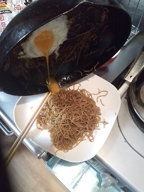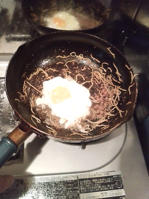 フライパンに、麺がこびり付いてしもうて、かなり軽量化されとるぢゃなぁですかっ。悔しいので、